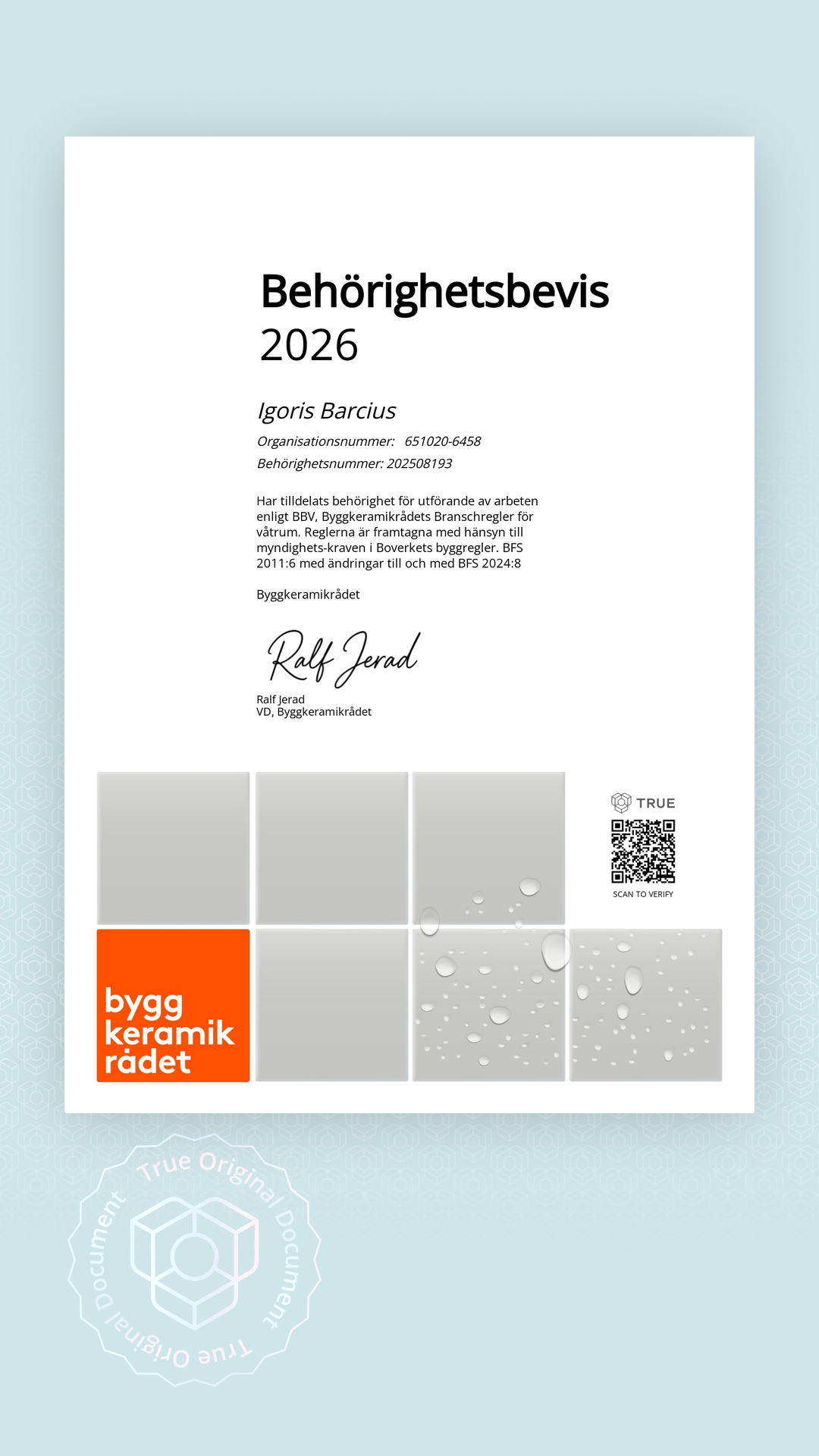 Detta dokument visar att företaget Igoris Barcius är behörigt i enlighet med Byggkeramikrådets branschregler för våtrum, BBV.