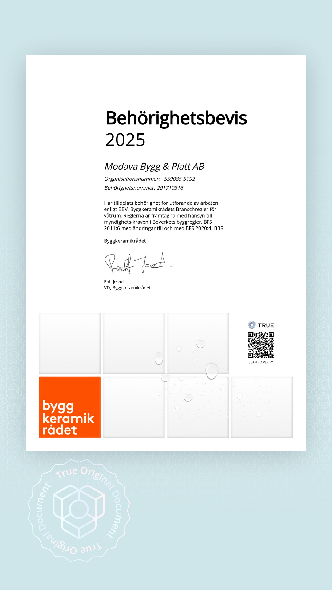 Detta dokument visar att företaget Modava Bygg & Platt AB är behörigt i enlighet med Byggkeramikrådets branschregler för våtrum, BBV.